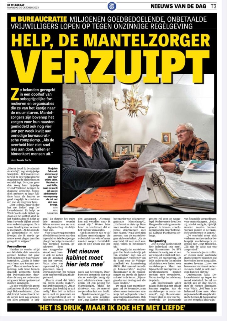 In De Telegraaf van 30 oktober: “help, de mantelzorger verzuipt”.