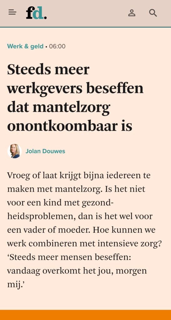 Vroeg of laat krijgt bijna iedereen te maken met mantelzorg. Is het niet voor een kind met gezondheidsproblemen, dan is het wel voor een vader of moeder. Hoe kunnen we werk combineren met intensieve zorg? ‘Steeds meer mensen beseffen: vandaag overkomt het jou, morgen mij.’